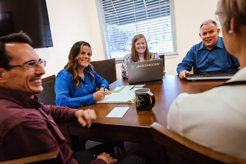James Moore members are gathered at a table in a conference room. The leader of the group is pointing across the table at an employee and smiling. The other two team members at the table are also looking and smiling at the employee.
